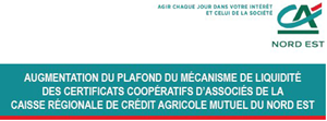 Les titulaires de Certificats Coopératifs d’Associés (C.C.A.) de la Caisse régionale de Crédit Agricole Mutuel du Nord Est (ci-après la Caisse régionale), réunis le 26 mars 2026 au Village by CA, à Bezannes, en Assemblée Spéciale, ont approuvé la décision du Conseil d’administration de la Caisse Locale de Développement Partagé (CLDP) d’augmenter son engagement au titre du mécanisme de liquidité à 45 % maximum du nombre de C.C.A. composant le capital social de la Caisse régionale (hors C.C.A. détenus par Sacam Mutualisation), aux lieu et place des 10 % prévus dans le contrat initial, plafond relevé à 20 % lors de l’Assemblée Spéciale des Porteurs du 09 janvier 2015.