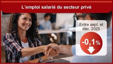 Entre septembre et décembre 2025, l’emploi salarié du secteur privé diminue à peine (-0,1 %, soit -28 700 emplois), comme au trimestre précédent (-0,1 %, soit -27 300 emplois), portant la baisse sur un an à -0,2 % (soit -40 800 emplois). Il excède encore largement son niveau d’avant-crise sanitaire, en 2019, de 5,3 % (soit +1,1 million d’emplois). Au quatrième trimestre 2025, l’emploi intérimaire est quasi stable (+0,1 %, soit +800 emplois), après une baisse modérée au trimestre précédent (-0,6 %, soit -4 300 emplois). Il se situe ainsi 1,1 % sous son niveau du quatrième trimestre 2024 (soit -7 500 emplois) et 9,0 % sous son niveau d’avant-crise sanitaire (soit -69 500 emplois). (INSEE)