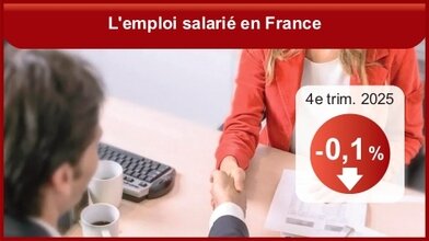 Au quatrième trimestre 2025, l’emploi salarié est quasi stable (-0,1 %, soit -40 100 emplois) après une stabilité au trimestre précédent (-5 300 emplois). Il se situe 0,2 % sous son niveau d’un an auparavant (soit -45 900 emplois), mais dépasse encore nettement son niveau d’avant la crise sanitaire, en 2019 (+4,9 % soit +1,3 million d’emplois). Dans le secteur privé, l’emploi salarié recule très légèrement (-0,1 %) comme au trimestre précédent (soit -20 900 emplois après -24 200 emplois). Sur un an, l’emploi salarié privé baisse de 0,3 % (soit -60 200 emplois) : Il s’agit du quatrième trimestre consécutif de léger recul sur un an. Toutefois, il excède toujours largement son niveau d’avant-crise sanitaire, de 5,4 % (soit +1,1 million d’emplois). (INSEE)