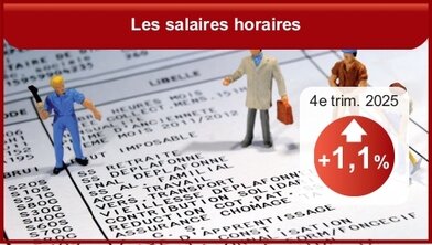 Les salaires horaires dans les secteurs marchands non agricoles (hors services aux ménages) accélèrent nettement au quatrième trimestre 2025 : +1,1 % en rythme trimestriel, après +0,3 % au trimestre précédent (données corrigées des variations saisonnières et des jours ouvrables). L’accélération provient essentiellement de la prime de partage de la valeur (PPV) qui augmente sur le trimestre (1,4 milliard d’euros ont été versés à ce titre aux salariés au quatrième trimestre 2025, après 0,5 milliard au trimestre précédent) mais diminue un peu sur un an (1,5 milliard d’euros fin 2024). À l’inverse, la hausse des salaires sur un an s’atténue au quatrième trimestre 2025 : +1,7 % après +2,0 % au trimestre précédent. (INSEE)