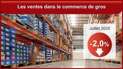 En juillet 2025, le volume des ventes du commerce de gros hors automobiles et motocycles se contracte sur un mois (‑2,0 % après +0,9 % en juin). Ce repli est essentiellement porté par le recul des ventes dans les « autres commerces de gros spécialisés (combustibles, bois, produits chimiques, etc.) » (‑3,7 %), dans les intermédiaires du commerce de gros (‑3,3 % après +0,3 %) et dans les produits alimentaires, boissons et tabac (‑2,7 % après ‑0,4 %). Le volume des ventes diminue également dans le commerce de détail hors automobiles et motocycles (‑0,9 %). Il se replie dans les magasins non spécialisés (‑1,5 %) ainsi que dans le commerce hors magasin (‑1,6 %). (INSEE)