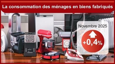 En novembre 2025, la consommation des ménages en biens fabriqués accélère (+0,4 % après +0,1 % en octobre 2025 – données révisées), portée par la nouvelle augmentation des dépenses en biens durables (+0,5 % après +0,3 % en octobre 2025 – données révisées) et par le rebond de celles en habillement-textile (+0,5 % après -0,1 % en octobre 2025). Les dépenses en « autres biens fabriqués », quant à elles, sont quasi stables (+0,1 % après -0,1 % en octobre 2025 – données révisées). En novembre 2025, la consommation en biens durables augmente de nouveau (+0,5 % après +0,3 % en octobre 2025 – données révisées), portée par un fort rebond des achats de biens d’équipement du logement (+1,9 % après -0,3 % en octobre 2025). (INSEE)