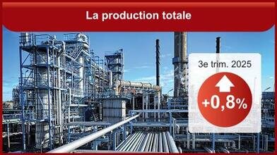 La production totale (biens et services) augmente de nouveau au troisième trimestre 2025, quoique plus fortement : elle est en hausse de 0,8 %, après +0,3 % au deuxième trimestre. La production dans l’industrie manufacturière accélère ce trimestre (+1,1 % après +0,1 %). La production rebondit fortement dans les raffineries (+10,6 % après -10,2 %) après un début d’année marqué par des arrêts pour maintenance. Elle est également en hausse dans les autres produits manufacturés (+0,7 % après +0,2 %) et dans les biens d’équipement (+0,4 % après +0,5 %). La production de matériels de transport ralentit mais reste dynamique ce trimestre (+2,8 % après +4,8 %), notamment dans l’aéronautique. (INSEE)
