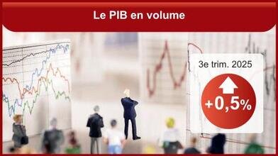 Le produit intérieur brut (PIB) en volume* accélère au troisième trimestre 2025 : il augmente de 0,5 %, après +0,3 % au deuxième trimestre. La demande intérieure finale (hors stocks) augmente (contribution de +0,3 point à la croissance après +0,2 point au deuxième trimestre). La formation brute de capital fixe repart modérément à la hausse (+0,4 % après 0,0 %) et la consommation des ménages garde son rythme (+0,1 % après +0,1 %). La contribution du commerce extérieur à la croissance est positive au troisième trimestre (+0,9 point après -0,4 point) : les exportations accélèrent nettement ce trimestre (+2,2 % après +0,3 %) tandis que les importations reculent un peu (-0,4 % après +1,4 %). (INSEE)