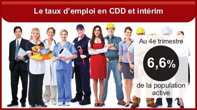 Le taux d’emploi en contrat à durée indéterminée (CDI) des 15-64 ans est quasi stable (-0,1 point) sur le trimestre à 51,2 % ; il excède de 0,2 point son niveau en 2024. Le taux d’emploi en contrat à durée limitée (CDD et intérim) est en hausse sur le trimestre (+0,2 point) et sur un an (+0,1 point), à 6,6 %. Le taux d’emploi indépendant est quasi stable sur le trimestre (+0,1 point) et sur un an (+0,1 point), à 9,0 %. En revanche, le taux d’emploi en alternance baisse sur le trimestre et sur un an, de 0,2 point, à 2,3 %, tout en restant largement supérieur à son niveau d’avant la crise sanitaire (+0,7 point). Au quatrième trimestre 2025, la part des jeunes de 15 à 29 ans qui ne sont ni en emploi, ni en formation, ni en études (NEET) augmente de 0,4 point, à 12,9 %. (INSEE)