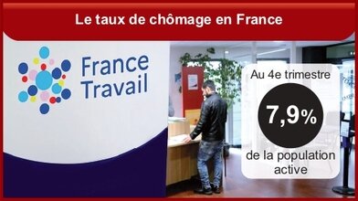 Au quatrième trimestre 2025, le nombre de chômeurs en France (hors Mayotte) au sens du Bureau international du travail (BIT) augmente de 56 000 par rapport au trimestre précédent, à 2,5 millions de personnes. Le taux de chômage au sens du BIT s’établit à 7,9 % de la population active, supérieur de 0,2 point à son niveau du troisième trimestre 2025 et de 0,6 point à celui du quatrième trimestre 2024. Il est à son plus haut niveau depuis le troisième trimestre 2021 mais demeure nettement au-dessous de son pic de mi-2015 (de -2,6 points). Au quatrième trimestre 2025, 4,4 % des personnes en emploi sont en situation de sous-emploi. (INSEE)