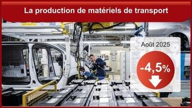 En août 2025, la production recule de nouveau dans la fabrication de matériels de transport (-4,5 % après -3,9 % – données révisées). En particulier, elle continue de diminuer nettement dans la fabrication d’autres matériels de transport ( -6,0 % après -5,5 % – données révisées), par contrecoup de sa hausse exceptionnelle de juin (+17,3 %). La production se replie nettement dans la cokéfaction et le raffinage (-4,7 % après +4,2 %) et elle baisse plus modérément dans les industries agro-alimentaires (-0,3 % après -1,2 %), ainsi que dans les industries extractives, énergie, eau (-0,6 % après +1,6 %). (INSEE)