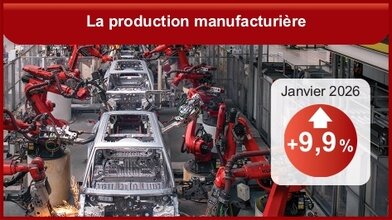 En janvier 2026, la production manufacturière rebondit, portée uniquement par la forte hausse de la fabrication de matériels de transport (+9,9 % après -12,8 %), en particulier dans les autres matériels de transport (+19,1 % après -20,1 %) et plus précisément dans la construction aéronautique et spatiale. À l’inverse, la production diminue dans toutes les autres branches : elle se replie dans la fabrication des « autres produits industriels (métallurgie, chimie, pharmacie, etc.) » (-0,9 % après +1,2 %), les industries agroalimentaires (-0,8 % après +1,9 %), la fabrication de biens d’équipement électriques, électroniques et informatiques (-0,5 % après +1,9 %). (INSEE)
