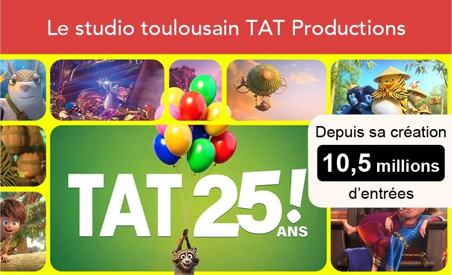 Le studio toulousain d’animation TAT Productions fête ses 25 ans. Pour l’occasion, le studio qui employait déjà 300 salariés en 2024, annonce avoir passé la barre des 10,5 millions d’entrées depuis sa création par David Alaux et Jean-François Tosti. La production doit cette réussite à plusieurs longs-métrages diffusés dans plus de 70 pays et traduits dans des dizaines de langues, comme Les As de la Jungle (2017), avec 2,1 millions d’entrées dans plus de 60 territoires, 4e film français au box office international la même année, et 6e en 2018. Ou encore, Pattie et la colère de Poseidon et ses 2,2 millions d’entrées, 3e film français le plus vu à l’étranger en 2023. Qu’il s’agisse de Terra Willy – Planète inconnue (2017), Pil (2021) et Les As de la jungle 2 (2023), pas un seul n’a fait moins d’un million d’entrées à l’international. Dernier succès en date, Falcon Express sorti cette année et ses 1,6 million d’entrées en seulement quelques mois. Le studio annonce déjà la sortie en 2026 de la série Les Aventures de Pil. Ses équipes travaillent aussi sur les longs-métrages Lovebirds (2027) et Ringo at Summer Camp, prévus pour 2027 et 2028.
