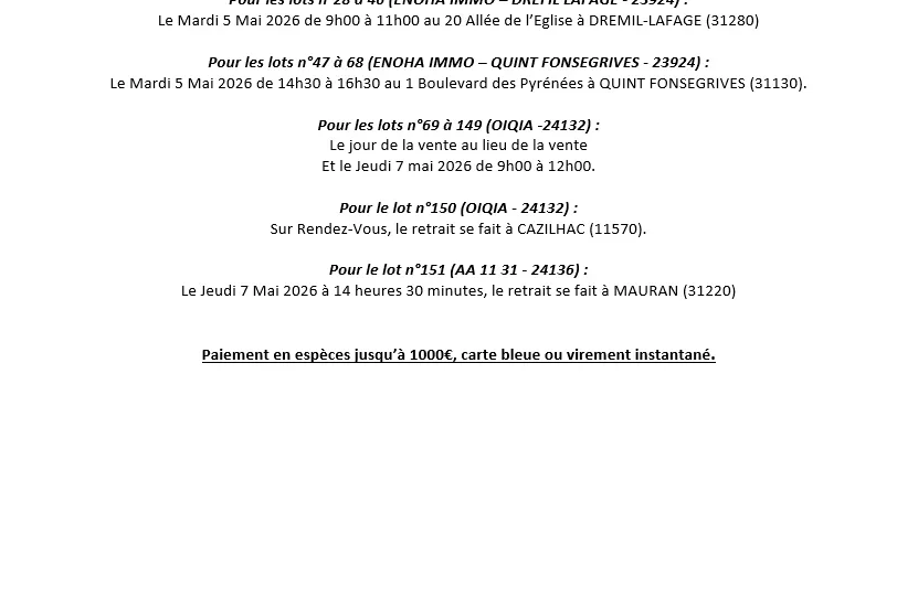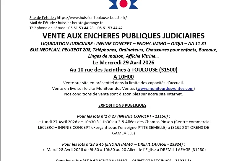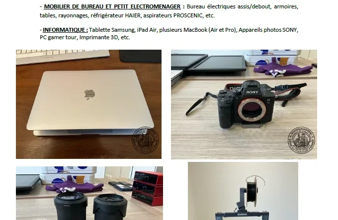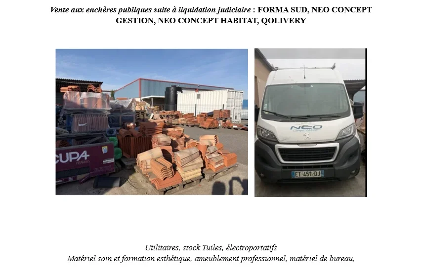 Utilitaires, stock Tuiles, électroportatifs, matériel soin et formation esthétique, ameublement professionnel, matériel de bureau