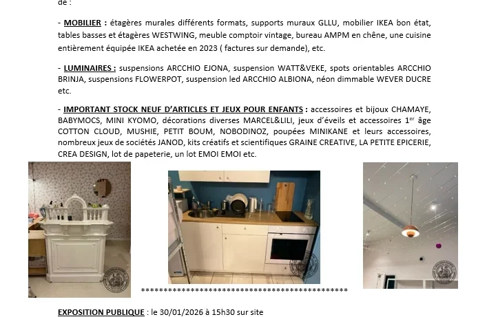Mobilier, luminaires, stock neuf d’articles et jeux pour enfants