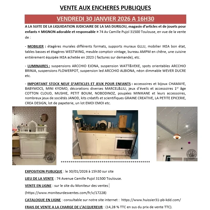 A LA SUITE DE LA LIQUIDATION JUDICIAIRE DE LA SAS DURILOU, magasin d’articles et de jouets pour enfants « MIGNON adorable et responsable » 74 Av Camille Pujol 31500 Toulouse, en vue de la vente de :