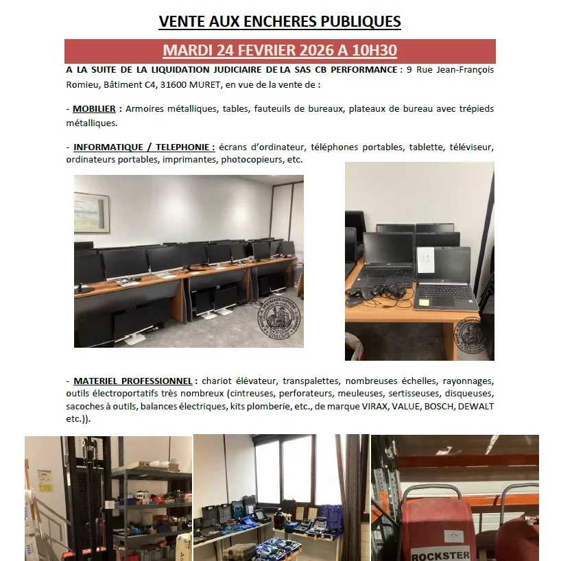 A LA SUITE DE LA LIQUIDATION JUDICIAIRE DE LA SAS CB PERFORMANCE : 9 Rue Jean-François Romieu, Bâtiment C4, 31600 MURET, en vue de la vente de :