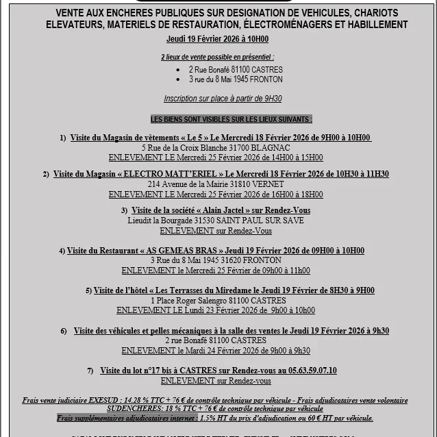 6) Visite des véhicules et pelles mécaniques à la salle des ventes le Jeudi 19 Février 2026 à 9h30