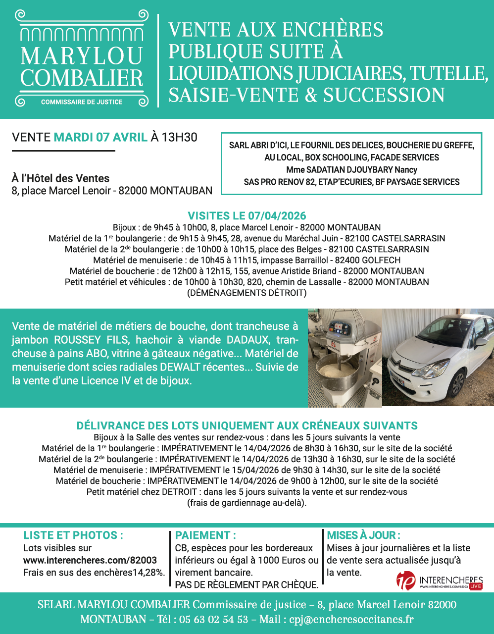 VENTE AUX ENCHÈRES PUBLIQUE SUITE À LIQUIDATIONS JUDICIAIRES, TUTELLE, SAISIE-VENTE & SUCCESSION