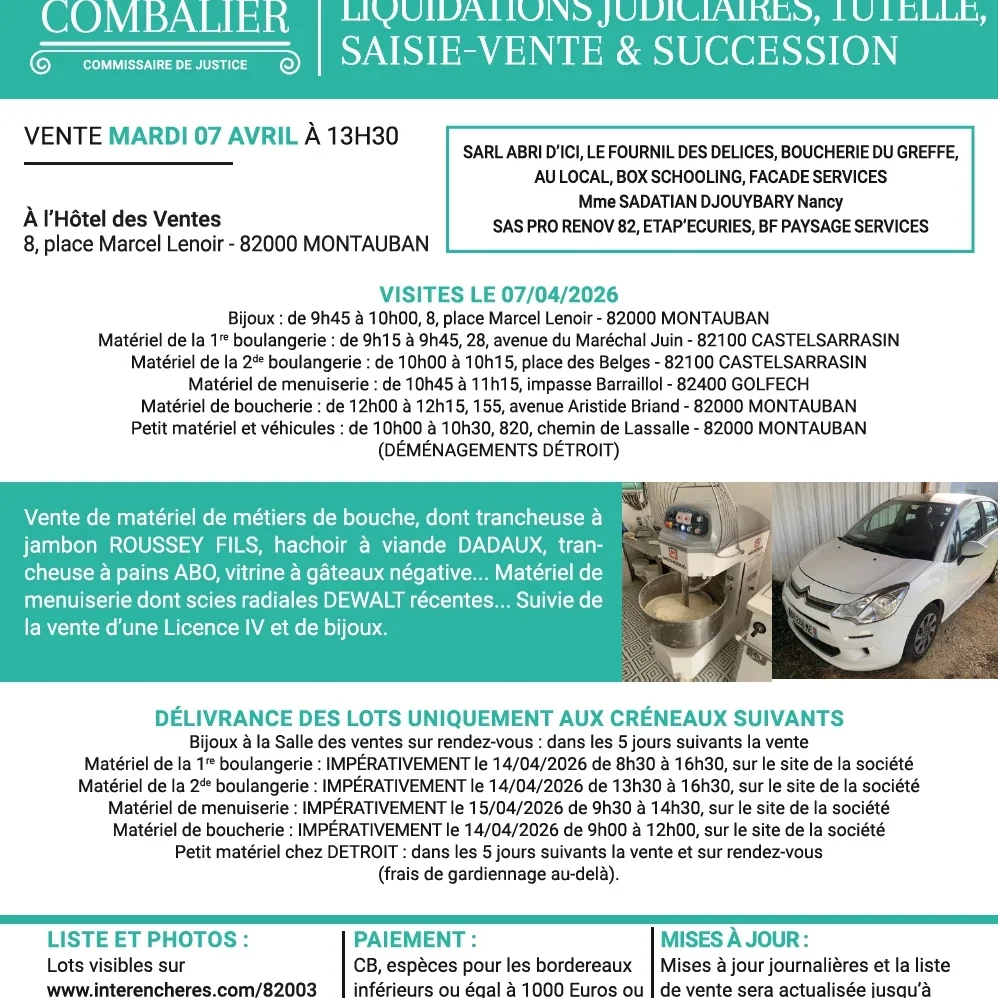 Vente de matériel de métiers de bouche, dont trancheuse à jambon ROUSSEY FILS, hachoir à viande DADAUX, trancheuse à pains ABO, vitrine à gâteaux négative... Matériel de menuiserie dont scies radiales DEWALT récentes... Suivie de la vente d’une Licence IV et de bijoux.