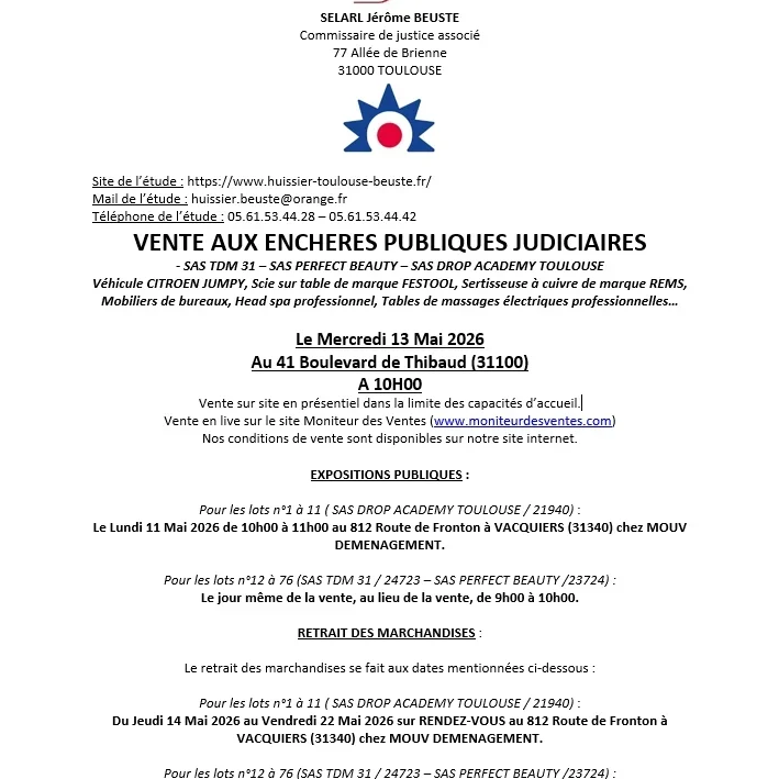 Pour les lots n°12 à 76 (SAS TDM 31 / 24723 – SAS PERFECT BEAUTY /23724) :