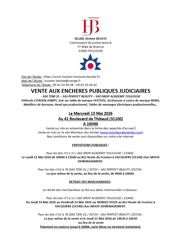 Pour les lots n°1 à 11 ( SAS DROP ACADEMY TOULOUSE / 21940) :